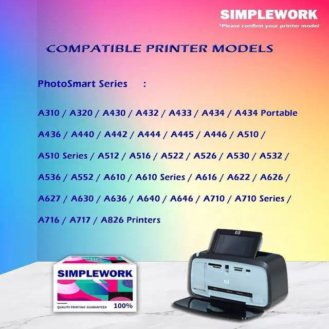 Compatible devices PhotoSmart A310 / A320 / A430 / A432 / A433 / A434 / A434 Portable / A436 / A440 / A442 / A444 / A445 / A446 / A510 / A510 Series / A512 / A516 / A522 / A526 / A530 / A532 / A536 / A552 / A610 / A610 Series / A616 / A622 / A626 / A627 / A630 / A636 / A640 / A646 / A710 / A710 Series / A716 / A717 / A826 Series and Other Inkjet Printers.