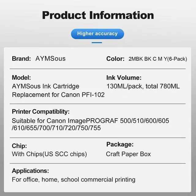 • Ink Volume: Total ink volume is 780ml(130ml/pack, total 6-pack) which include 2 pack PFI-102MBK PFI-102 Matte Black (Pighment ink), 1 pack PFI-102BK PFI-102 Black (Dye ink),1 pack PFI-102C PFI-102 Cyan (Dye ink),1 pack PFI-102M PFI-102 Magenta (Dye ink), 1 pack PFI-102Y PFI-102 Yellow (Dye ink).