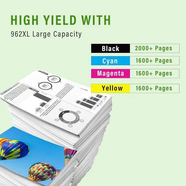 962XL Large Capacity to Print More PagesExperience exceptional printing capacity with up to 2000 pages from black and 1600 pages from color ink cartridges (5% coverage on A4). Our high-capacity HP 962XL ink cartridges deliver reliable performance for all your printing needs.