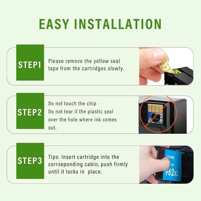 Sealed Packaging & After-Sale ServiceEach HP 962XL black & color combo pack comes in high-quality, durable packaging that ensures product integrity during shipping and storage. If they can't work at first, here are some instructions for you: (1)Please make sure the black cover had been removed before you installing the ink. (2)Please take soft tissue paper with ethyl (clean water is also fine) to wipe print head of ink-jet. (3)Please take an eraser/soft tissue paper to wipe the chips and the contact point of both ink-jet and the printer to solve bad-connection problem.