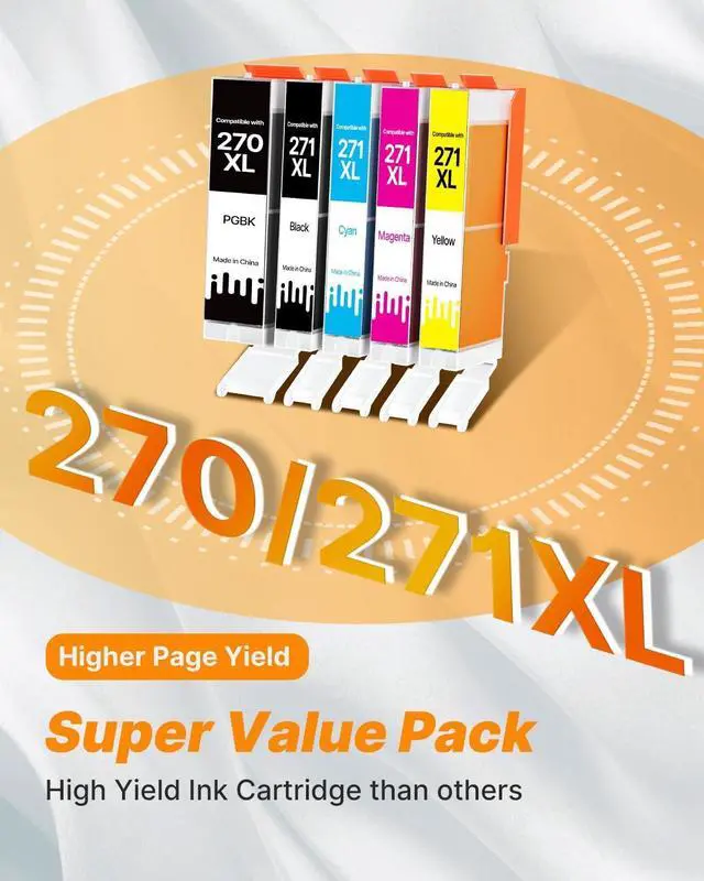 Package Contents: 5 Color Value Pack of compatible 270 271 ink cartridges replacement including 1 x 270XL PGBK, 1 x 271XL Black, 1 x 271XL Cyan, 1 x 271XL Magenta, 1 x 271XL Yellow and 1 x User Guide
