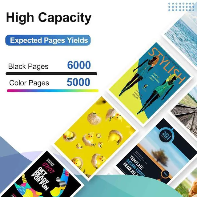High Page Yield: High yields up to 6000 pages per Black ink cartridge and 5000 pages per color ink cartridge (5% coveragae*A4 paper)