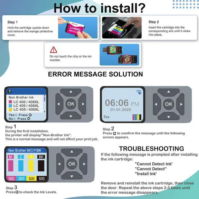 Installation Tips: [1].Don't remove or touch the CHIP.[2]. When the printer prompts "non-original", please click OK or Next to continue. [3].When the printer appears "low ink", "empty", "replace ink cartridge" and other prompts, please remove the ink cartridge and reinstall it several times