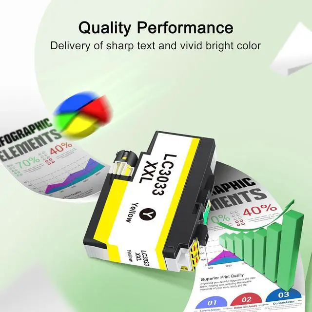What's in the box: LC3033 XXL ink cartridges bk/c/m/y super high yield ink replacement for Brother LC3033 ink cartridges (Includes 2 * LC3033XXL Black, 1 * LC3033XXL Cyan, 1 * lc3033XXL Yellow, 1 * lc3033XXL Magenta, 1 * user guide)
