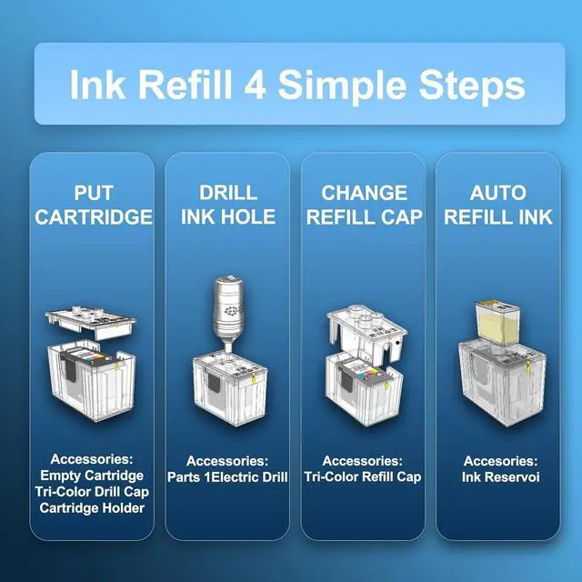 Complete Set: This package includes 3x Black, 2x Cyan, 2x Magenta, 2x Yellow, Additional Accessories: 1x Cartridge Holder, 1x Black Drill Cap, 1x Tri-color Drill Cap, 1x USB-Powered Drilling Tool, 1x Pair of Cleaning Gloves, 1x User Manual, Note: Please scan the QR code or read the manual before refilling to ensure proper usage.