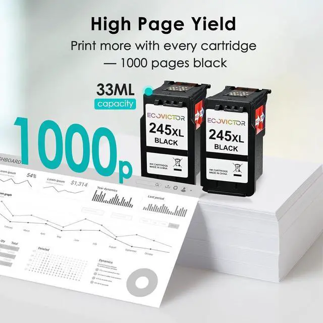 Long-Lasting Page Yield: EcoVictor 245 xl ink cartridges for canon 245xl black ink prints up to 450 pages each (at 5% coverage). EcoVictor for canon pg-245xl black ink cartridge is perfect for home, school, or office use. Enjoy long-lasting printing performance without the hassle of frequent replacements.