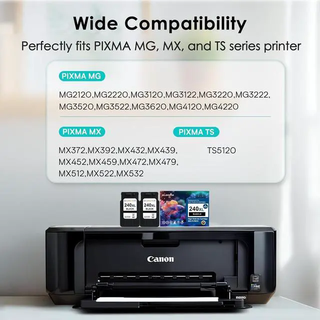 Package Contents: 2 PG240XL black ink cartridge replacement for canon 240 xl black ink cartridge (this is not an OEM product). For canon pg 240 black ink cartridge has undergone strict inspections to ensure that each canon 240 ink is compatible with your printer perfectly and prints well. This is the perfect holiday or birthday gift for home, office and back-to-school students.