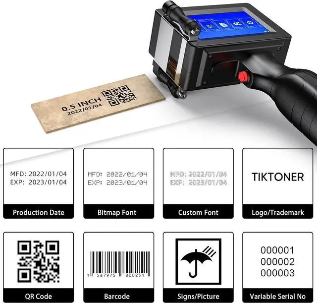 Package of Handheld Inkjet CoderHandheld handheld printer complies with ergonomic design, which is comfortable to hold and use. Package: 1× Handheld Printer, 1× Touch Pen, 1× Powder adapter, 1× U-disk, 1× Ink cartridge(Black), 1× Sheet Metal Positioner, 1× Instruction book, 1x Portable Case. TIKTONER will be provided technical support.