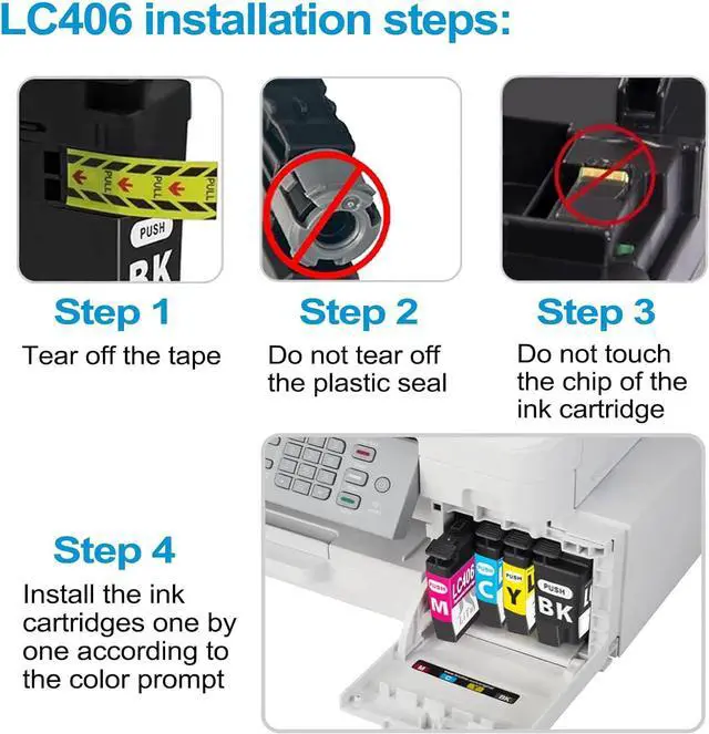 Package: 4 Packs LC406 ink cartridges for Brother printer - 1 x LC406bk Black, 1 x LC406c Cyan, 1 x LC406m Magenta, 1 x LC406y Yellow, replacement for Brother LC406 OEM ink cartridges.