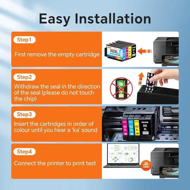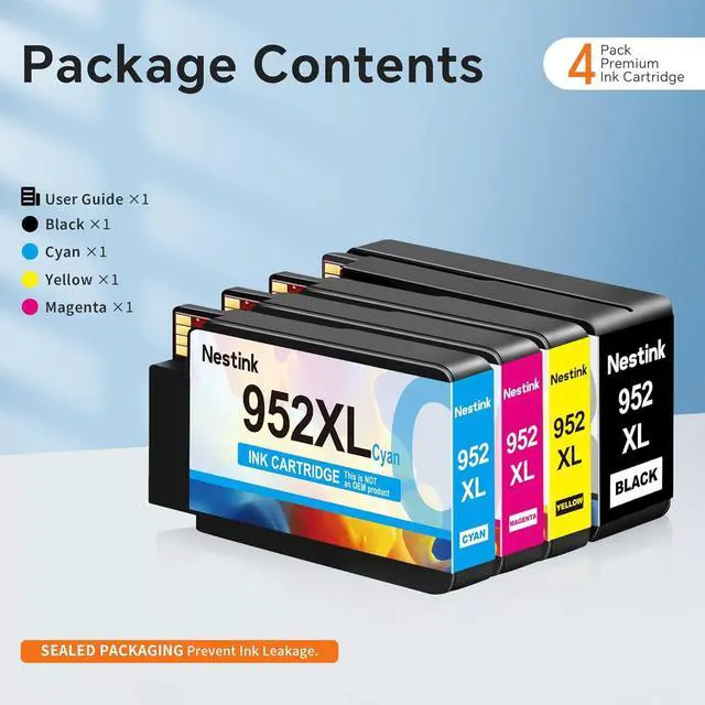 Package Contents: 1 x Black 952 XL, 1 x Cyan 952 XL, 1 x Magenta 952 XL, 1 x Yellow 952 XL (4 cartridges in total). Specially Designed Anti-Clog Ink Formula ensures high-performance printing and prevents printhead clogs