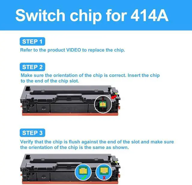 Purchase NotesLCL compatible 414A/414X toner cartridge is without chip. Please use it with your reserved OEM toner cartridge chip. Please refer to the side VIDEO tutorial to replace the chip. We are responsible for providing chip replacement tools.Please check the CHIP installation position refer to the picture beside the product picture.