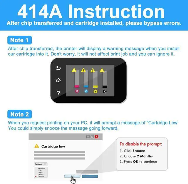 Purchase NotesIf computer prompts "the toner cartridge is low", please click "Snooze" button and choose "2 months". It will not affect your normal use.