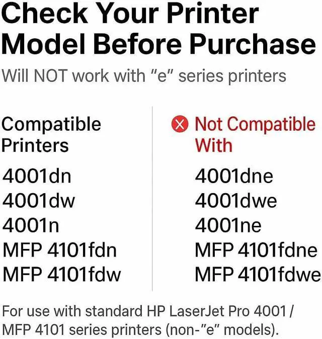 NOT COMPATIBLE WITH: Laser Printers 4001DNE, 4001DWE,4001NE, MFP 4101FDNE, MFP 4101FDWE.