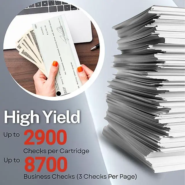 HIGH YIELDBased on the industry-standard 5% coverage, our high-yield cartridges will produce 3000 single checks or 9000 business checks at 3 checks per page.