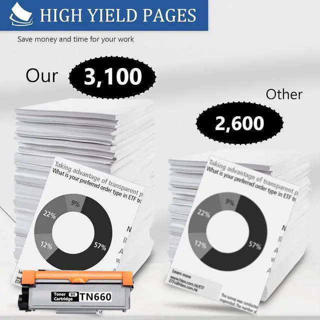 Cartridge yield (approx): TN660 Toner Cartridge 3,100 pages per black cartridge at 5% coverage (Letter/A4)
