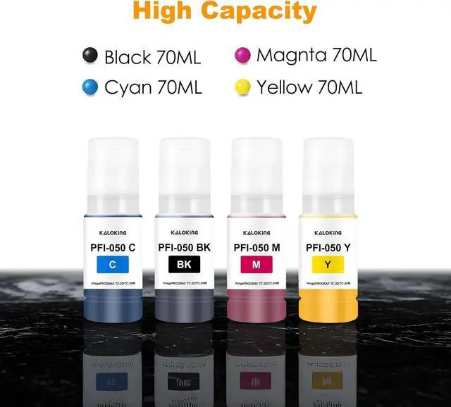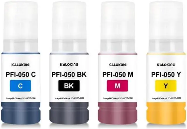 Package Contents: 4 Pack PFI-050 ink tank (Black x1, Cyan x1, Magenta x1, Yellow x1) All with latest chips