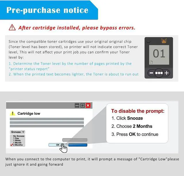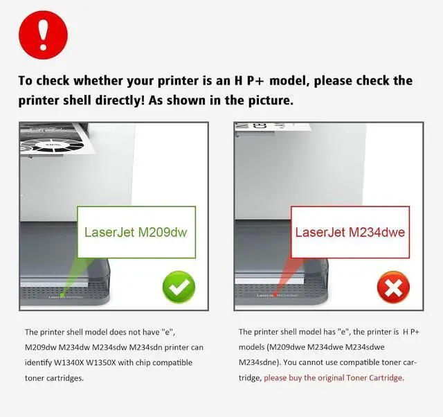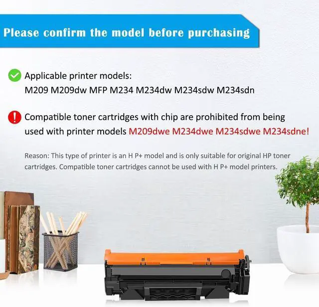 1. Important Notice: Our W1340A/W1340X compatible toner cartridges are not compatible with H P+ printers that have model numbers ending with "e". H P+ printer only works with original toner cartridge, can not work with compatible toner cartridge.