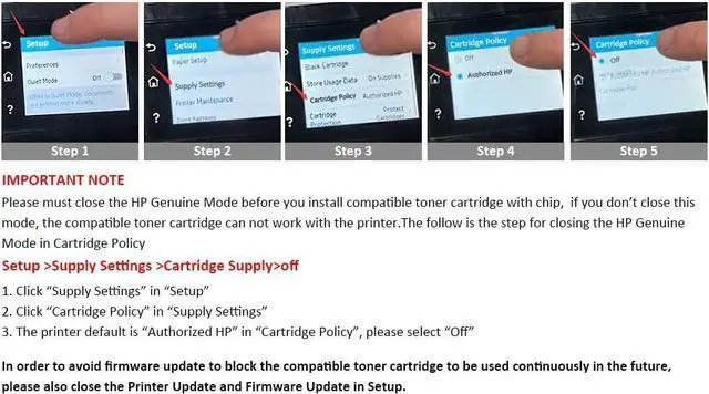 5. Important Note: Please must close the H P Genuine Mode before you install compatible toner cartridge with chip, the step is Setup >Supply Settings >Cartridge Supply>off. In order to avoid firmware update to block the compatible toner cartridge to be used continuously in the future, please also close the Printer Update and Firmware Update in Setup.