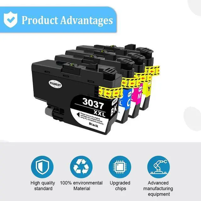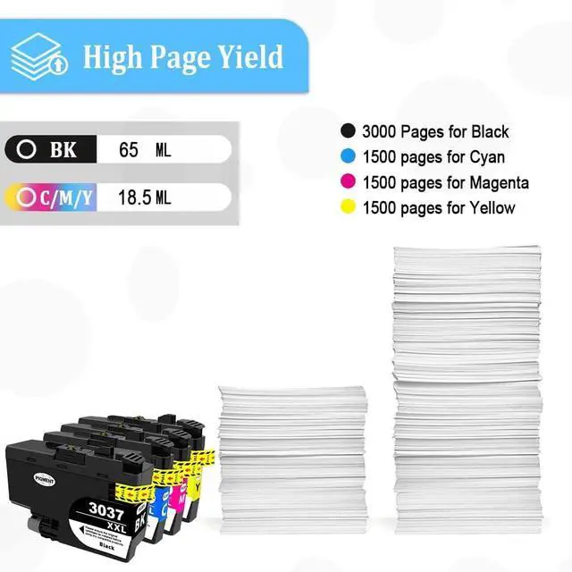 Package included 4 Pack Compatible ink cartridges replacement for Brother LC3037 LC3037XXL High Yield (1 Black 65ml, 1 Cyan 18.5ml, 1 Magenta 18.5ml, 1 Yellow 18.5ml ).