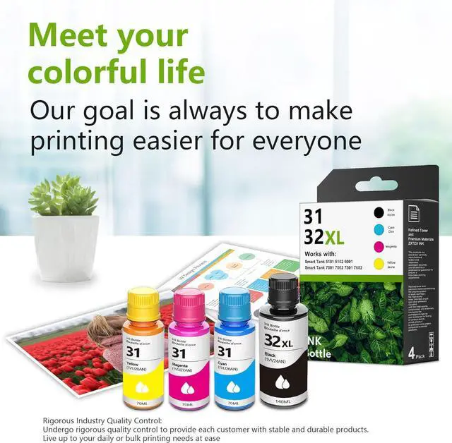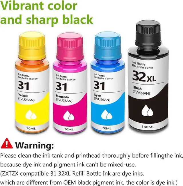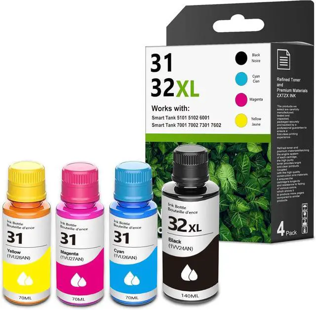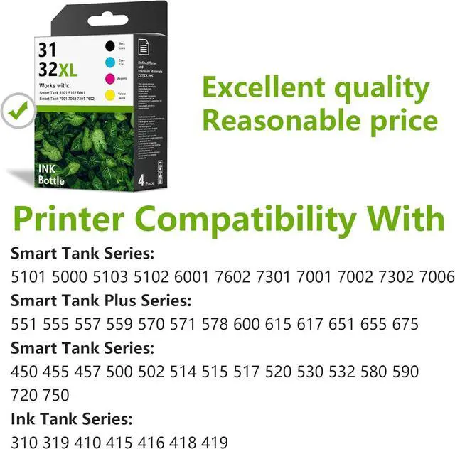 32XL/31 ink bottle to use with: Smart tank 5101 5000 7602 7301 6001 7001 5103 5102 7002 7302 7006 ink refill, smart tank plus 651 551 555 557 559 570 571 578 655 617 600 615 675, smart tank 450 455 457 500 515 520 530 580 590 517 532 502 514 720 750, and ink tank 310 319 410 415 416 418 419 Series Printer