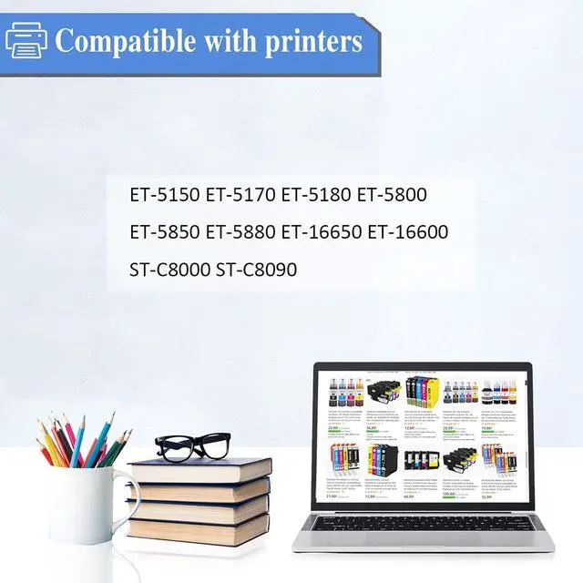 Compatible with Printers Compatible with Pro ET-5150, ET-5170, ET-5180, ET-5800, ET-5850, ET-5880, ET-16650, ET-16600 Wireless All-in-One Supertank Printer, WorkForce ST-C8000 ST-C8090 Supertank Color MFP Printer.