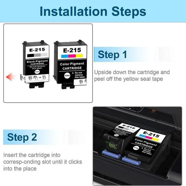 Easy Installation: Push the 215 ink cartridge firmly until you hear a click to lock it in place. Make sure the yellow chip fully contacts the printers pins. After installation, wait 23 minutes for the printer to recognize the cartridge before printing.