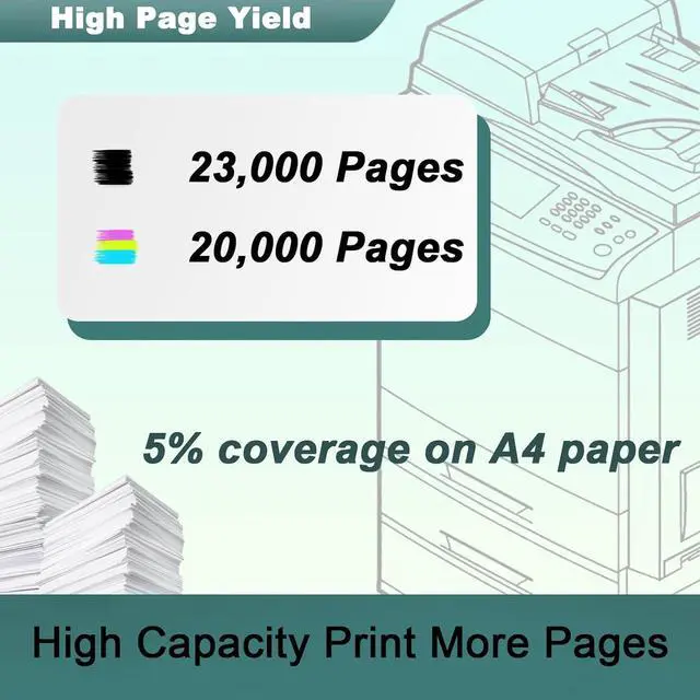 High Yield: 23,000 Pages per black Toner Cartridge and 20,000 Pages per color Toner Cartridge (5% coverage on A4 paper)