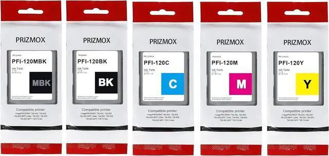 Package Contents: PFI-120 Pigment Ink Tank 5-Pack (Matte Black, Black, Cyan, Magenta, Yellow) PFI-120MBK PFI-120BK PFI-120C PFI-120M PFI-120Y