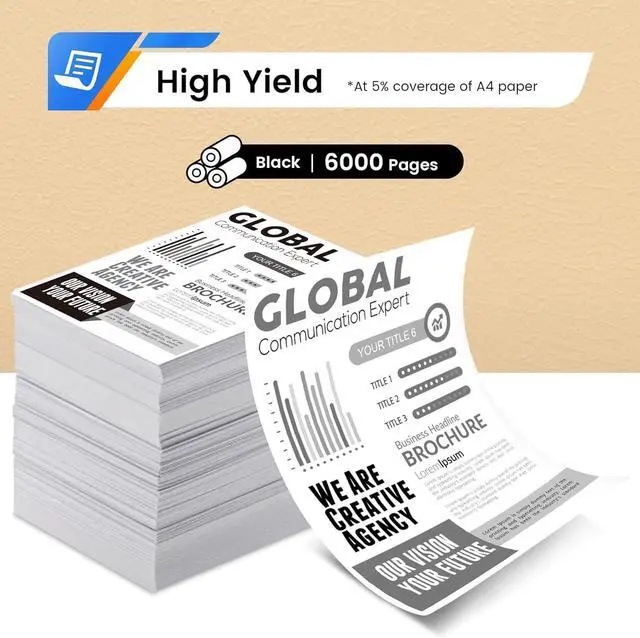 Page Yield: Up to 6,000 pages per black toner cartridge at 5% coverage.
