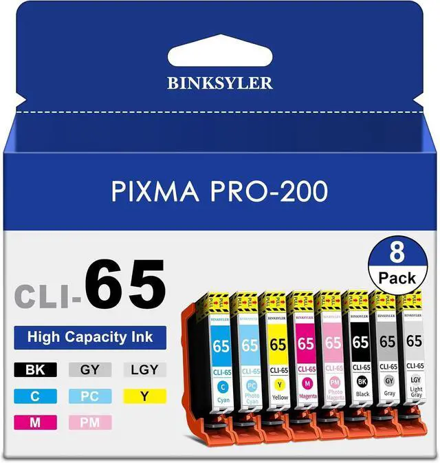 Package Contents: 8 color pack CLI-65 65 Ink Cartridges (Black / Cyan / Magenta / Yellow / Photo Cyan / Photo Magenta / Gray / Light Gray)