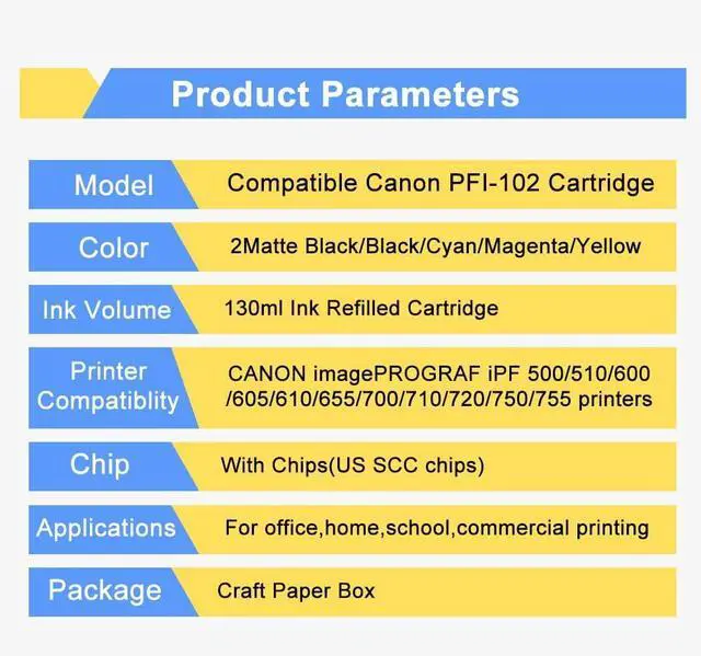Package Contents: Compatible for Canon PFI-102 Ink Cartridge, 6 Pack, 2x Matte Black, Black, Cyan, Magenta, Yellow, 130ml per box.Each Ink Cartridge is packed with PE Plastic bag, and then put 6pcs ink cartridge into carton boxes. This packing method can avoid damage or ink leak.