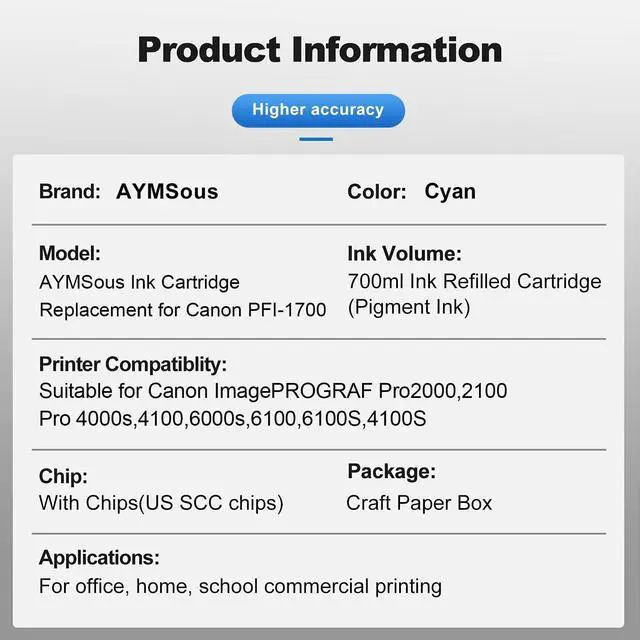 Package Contents: 1 Pack Photo Cyan 700ML Pigment ink cartridge with SCC chip