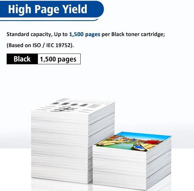 High Page Yield & CodeStandard Capacity, 1500 pages black at 5% coverage, A4 paper.