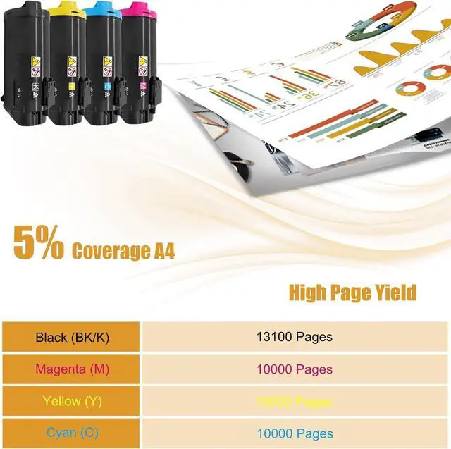 Page Yield: Up to 13100 pages per Toner Cartridges (Black) at 5% coverage. Up to 10000 pages per color Toner Cartridges (Cyan, Magenta, Yellow) at 5% coverage. These Toner Cartridges provides clear and vibrant printing effect, which gives you a good visual feast.