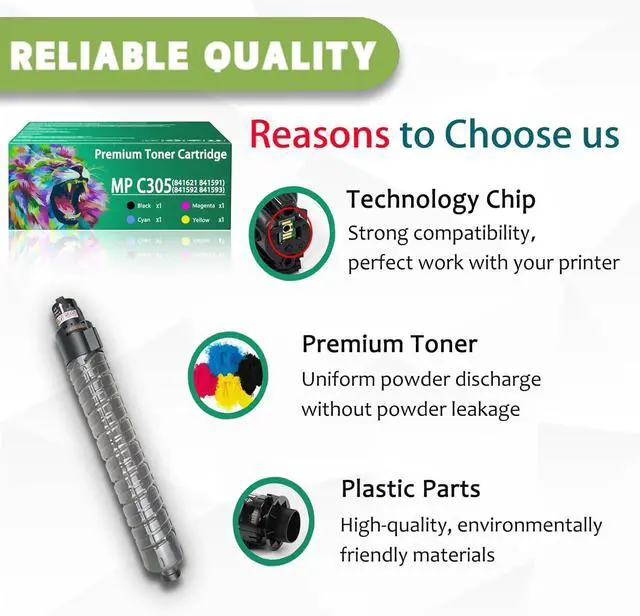 Our Advantages: MP C305 toner cartridge uses premium toner, with fine particles, low scrap rate, and no ink leakage, ensuring sufficient number of printed pages, high color saturation, and clearer color printing, creating a more realistic creation for you and your eyes visual effects