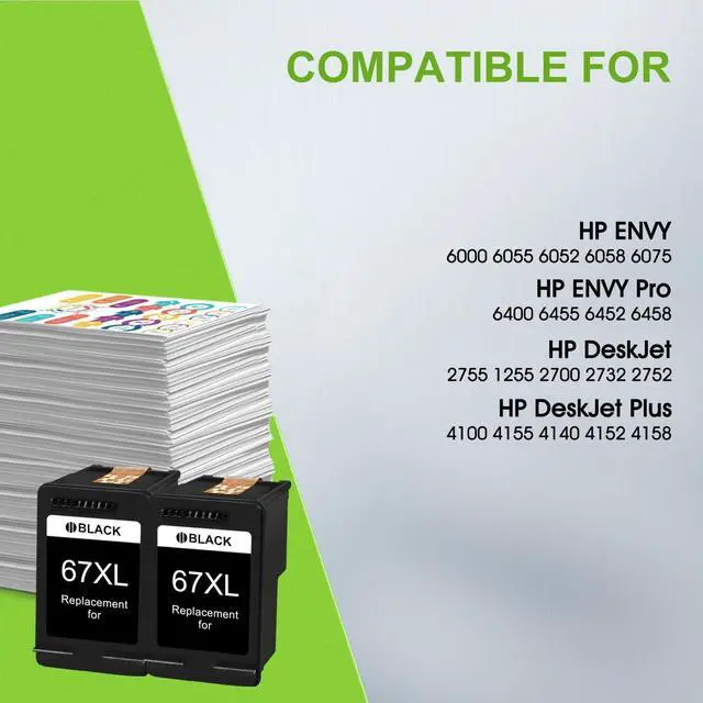 For HP 67 Ink Cartridges Printer Compatibility :Envy Series6000, 6010, 6020, 6022, 6030, 6032, 6034, 6052, 6055, 6058, 6075; for HP Envy Pro 6400, 6420, 6422, 6430, 6432, 6452, 6455, 6458, 6464, 6475