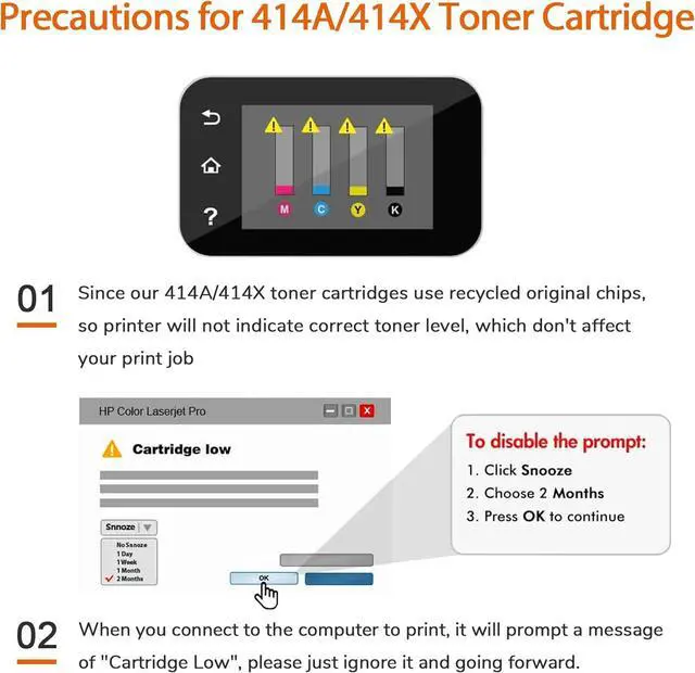 NOTE: As our 414A/414X toner cartridges utilize recycled chips, your printer may not accurately display the toner level, but this discrepancy will not impact your printing tasks