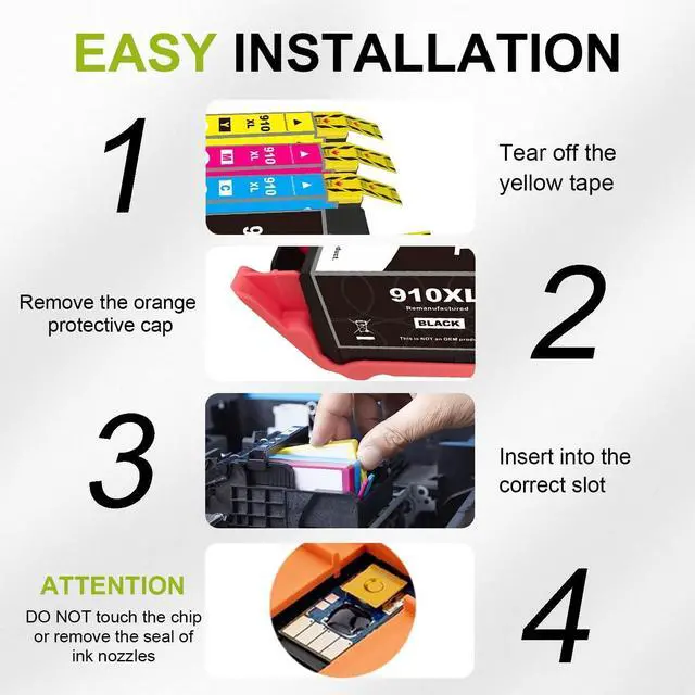 Excellent Performance: In order to ensure our user get good printing experience that each product will through mutiple rigorous test before they leave the factory, and our replacement for HP 910 ink cartridge have been awarded ISO9001 certification.