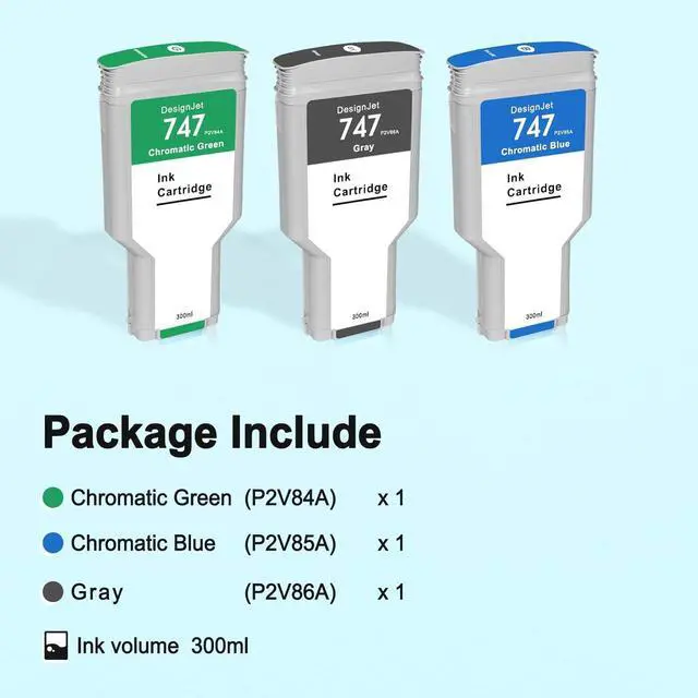 Package Contents: 1 x Chromatic Green (P2V84A), 1 x Chromatic Blue (P2V85A), 1 x Gray (P2V86A), each ink cartridge has a capacity of 300ml