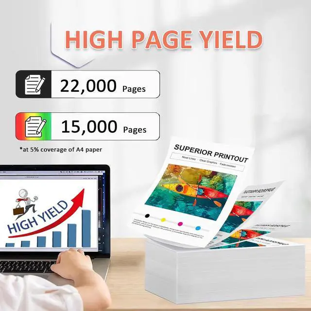 High Yield22,000 pages per 006R01453 black toner cartridge & 15,000 pages per 006R01456 cyan, 006R01455 magenta and 006R01454 yellow toner at 5% coverage of A4 paper