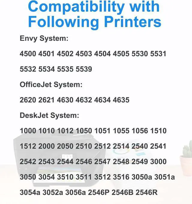 Compatible Printer:ENVY 4500, ENVY 5530, Officejet 4630, Deskjet 2540 , Deskjet 1000, ENVY 5535, ENVY 4502,Deskjet 2549 , Deskjet 1512 , Deskjet 1000, Officejet 26 ENVY 5534, Deskjet 2050, Deskjet 10 , Deskjet 3000 , Deskjet 1055 , Deskjet 3054