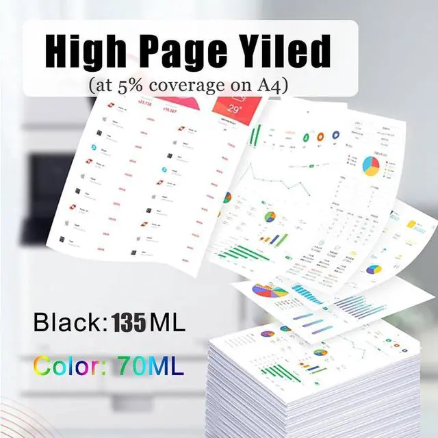 Efficient PrintingBlack capacity 135ml, color capacity 70ml Ink (with 5 percent coverage on A4 pages), reliable printing and save time by avoiding common Printing problems. Premium quality carbon prints crisp text and graphics than others.