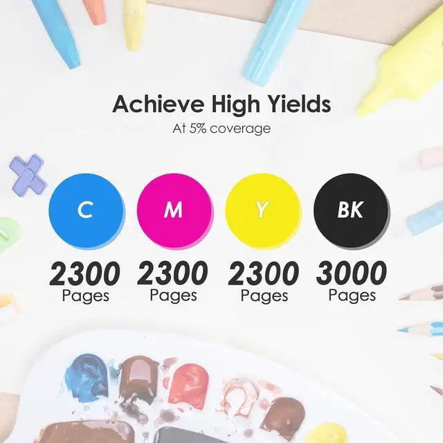 High Page Yield: BK 3000 Pages Yield, per C/M/Y 2300 Pages Yield at 5% coverage of A4 paper