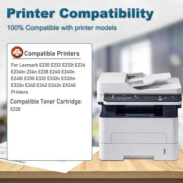 Compatible PrintersE230 toner cartridges for Lexmark E230 E232 E232t E234 E234tn 234n E238 E240 E240n E240t E242 E330 E332 E332n E332tn E332n E340 E342 E342n EX340