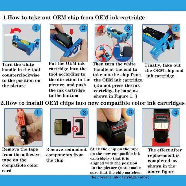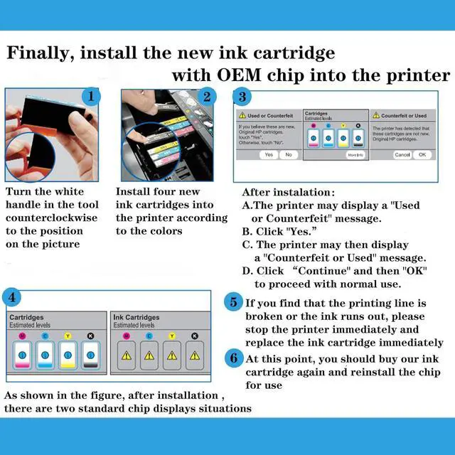 ( ) : Make sure you have the OEM 923 ink cartridges for hp s and follow the instructions to remove the chip from OEM toner and install it to our product. ( + )
