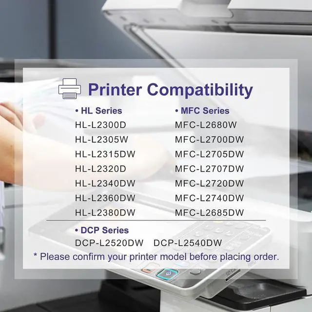 Compatible Printer Models: The tn660 toner cartridge black replacement for MFC Series: MFC-L2680W, MFC-L2700DW, MFC-L2705DW, MFC-L2707DW, MFC-L2720DW, MFC-L2740DW, MFC-L2685DW Printer. HL Series: HL-L2300D, HL-L2305W, HL-L2315DW, HL-L2320D, HL-L2340DW, HL-L2360DW, HL-L2380DW Printer. DCP Series: DCP-L2520DW, DCP-L2540DW Printer. Warm Tips: Please confirm your printer model before placing order