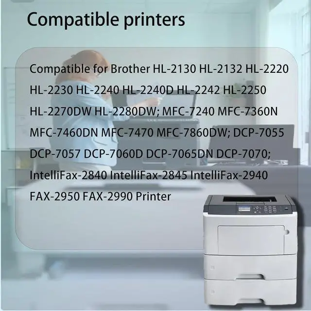 Compatible for Brother HL-2130 HL-2132 HL-2220 HL-2230 HL-2240 HL-2240D HL-2242 HL-2250 HL-2270DW HL-2280DW; MFC-7240 MFC-7360N MFC-7460DN MFC-7470 MFC-7860DW; DCP-7055 DCP-7057 DCP-7060D DCP-7065DN DCP-7070; IntelliFax-2840 IntelliFax-2845 IntelliFax-2940 FAX-2950 FAX-2990 printer