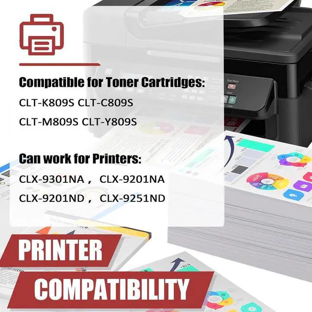 High compatibilityCLT-K809S CLT-C809S CLT-Y809S CLT-M809S toner cartridges are specially designed to be compatible for Samsung CLX-9301NA CLX-9201NA CLX-9201ND CLX-9251ND Printers.