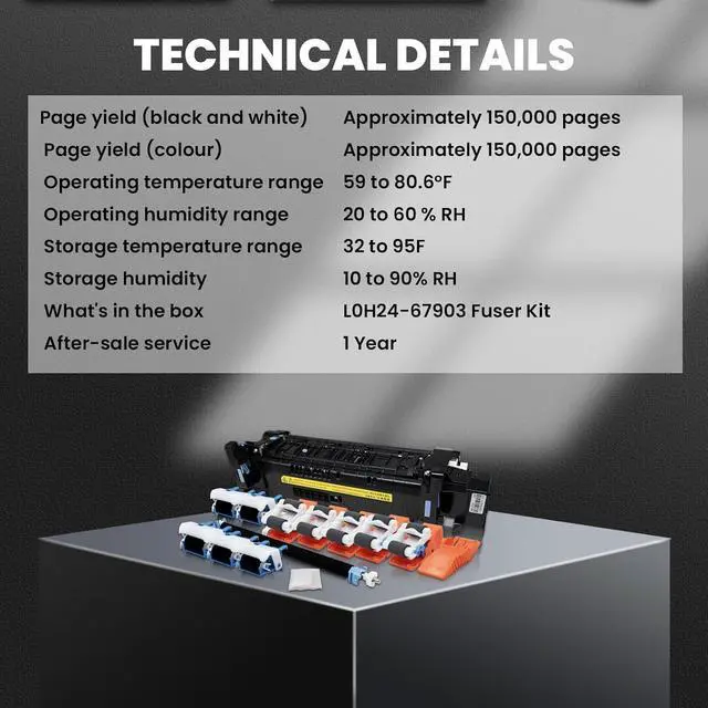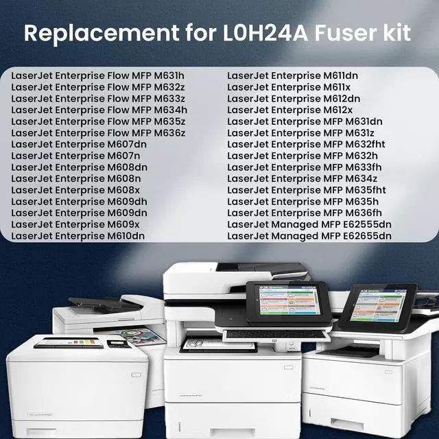 Widely compatibleThis L0H24A fuser maintenance kit can be used in conjunction with part numbers; L0H24A, L0H24-67901, RM2-1256, J8J87A, J8J87-67901, and J8J70-67903, and compatible with LaserJet Enterprise M607, M608, M609, M631, M632, and M633 printers. The production capacity is 225000 pages and the voltage is -110V.