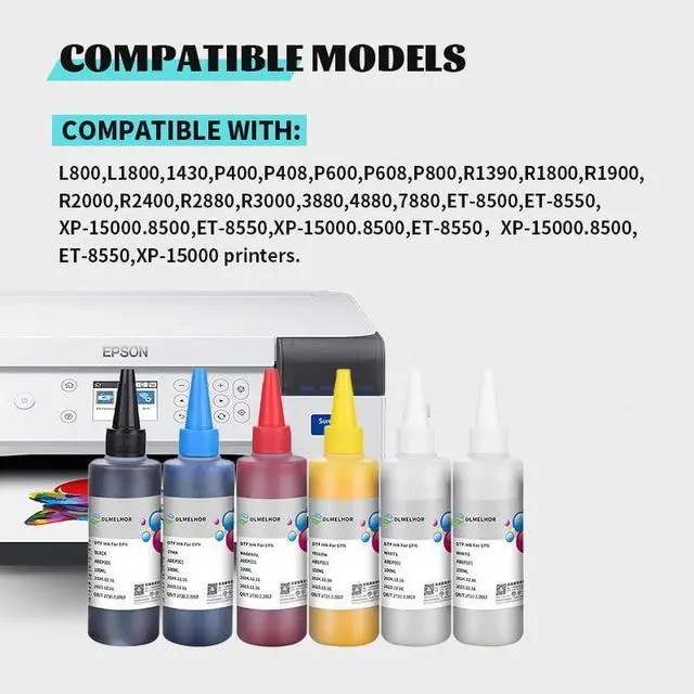 Compatible Printers: DTF inks are compatible with a wide range of popular printer models including L800, L1800, 1430, P400, P408, P600, P608, P800, R1390, R1800, R1900, R2000, R2400, R2880, R3000, 3880, 4880, 7880, 8500, ET-8550, XP-15000. 8500, ET-8550, XP-15000 printers. Meet your printing needs.